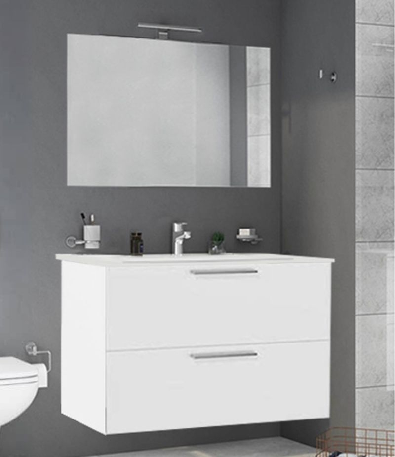 Mobile bagno sospeso della serie MIAMI con due cassetti, con chiusura rallentata soft-close e maniglie cromate, la composizione comprende il lavabo in ceramica con troppopieno e foro per miscelatore, lo specchio filo lucido reversibile e applique LED.